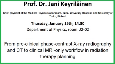 Giovedì 15 gennaio alle 14.30 in aula U2-02 si terrà il seminario "From pre-clinical phase-contrast X-ray radiography and CT to clinical MRI-only workflow in radiation therapy planning" tenuto dal Prof. Dr. Jani Keyriläinen, Chief physicist of the Medical Physics Department, Turku University Hospital, and University of